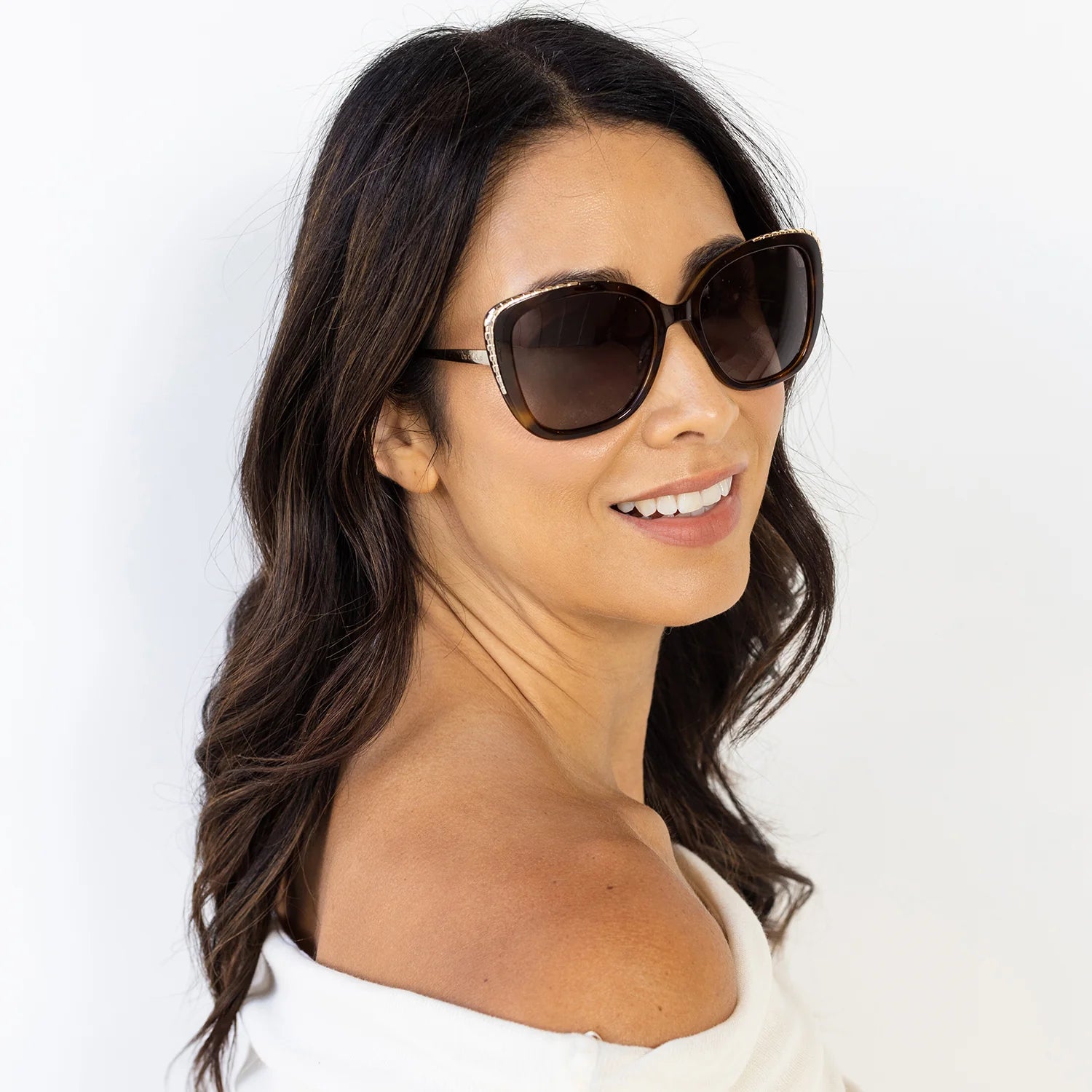 Bronte takes a classic rectangular frame and tortoiseshell pattern and gives it a modern twist with just the right peppering of gold accents to catch the sunlight beautifully.