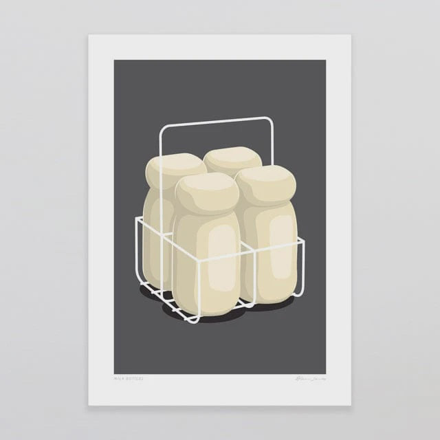 Add a touch of nostalgia to your home with the Milk Bottles Art Print by NZ artist Glenn Jones. This humorous print features milk bottle lollies in an old milk bottle carrier, creating a playful twist on the classic method of receiving and carrying glass milk bottles. Against a dark grey background, this art print is a charming and unique addition to any space.
