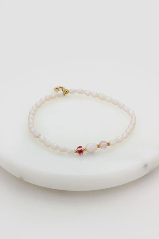 The Amber Bracelet combines timeless elegance with a modern twist. Featuring delicate freshwater pearls, a soft pink stone, and a bold red enamel bead, this piece is finished with fine gold accents for a touch of warmth. Designed to be worn solo or layered, it’s the perfect everyday statement.