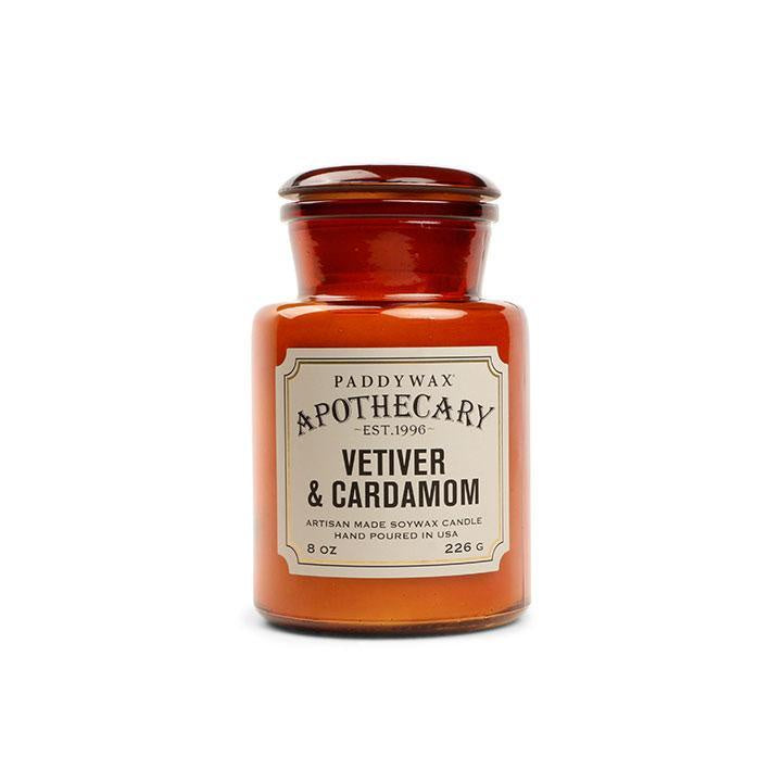 Paddywax signature soy wax candle, hand poured into an 8-ounce Apothecary bottle Up to 60 hours of burn time Vetiver and Cardamom scent created with all natural fragrances Made in the United States with attention to detail Provides a celebration for the senses, transforming your surroundings with elegant looks and enticing fragrances that make every day extraordinary
