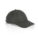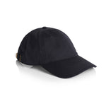Low profile six panel cap, curved peak Adjustable fastener with metal clasp, tonal under-peak lining Light weight 100% cotton One size fits all