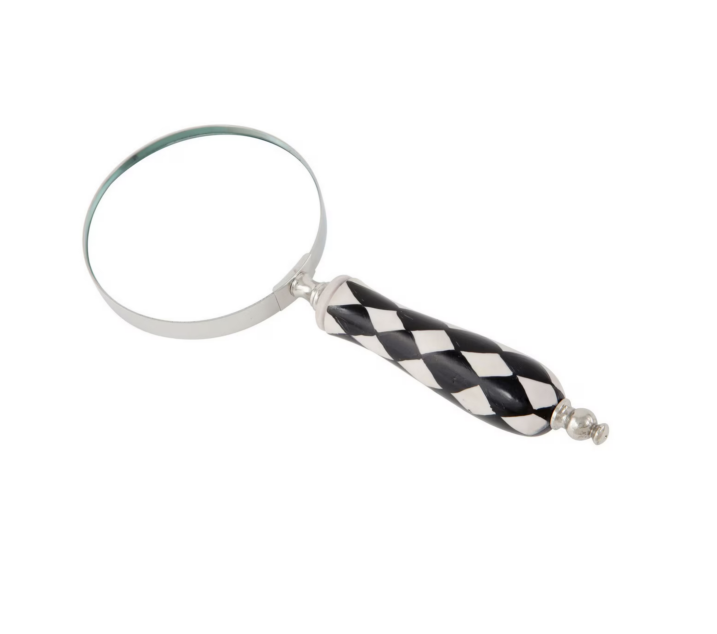 SMALL DÉCOR CAN REALLY ADD CHARACTER AND STYLE TO ANY SPACE. THIS BRASS ALUMINIUM MAGNIFIER W/ BLACK AND WHITE HANDLE IS A DECORATIVE ITEM FOR LIGHT USE ONLY, THE UNIQUE DESIGN OF THIS MAGNIFIER GLASS MAKES IT A CLASSIC