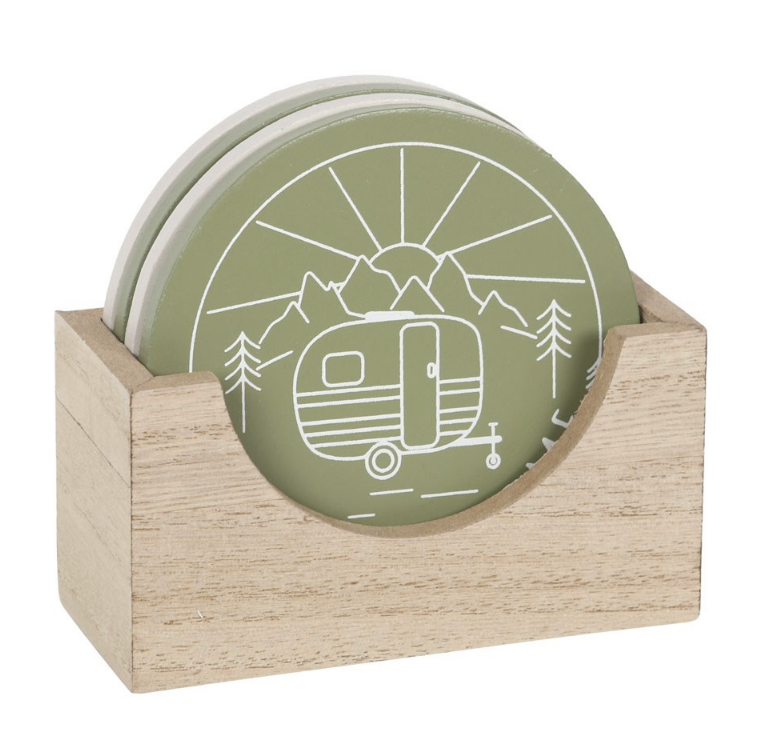 H:9 x W:9 x D:2 cm - This set of 4 camping coasters is perfect for keeping in caravans and campervans. Designs include; Not All Who Wander Are Lost (white), tree pattern (green), Home from Home (green) and No Place I'd Rather Be (white) in a wooden holder.