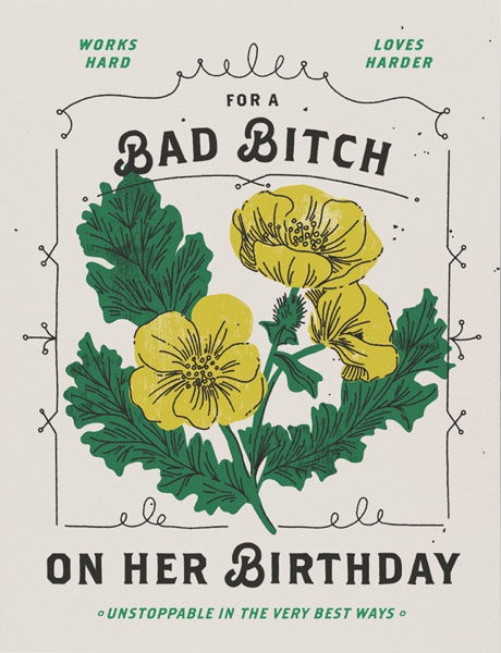 Card-Bad Bitch Created by artist Dylan Mierzwinski Printed with soy inks on 60% tree free recycled paper 140x108mm Ivory envelope Cellophane wrapped
