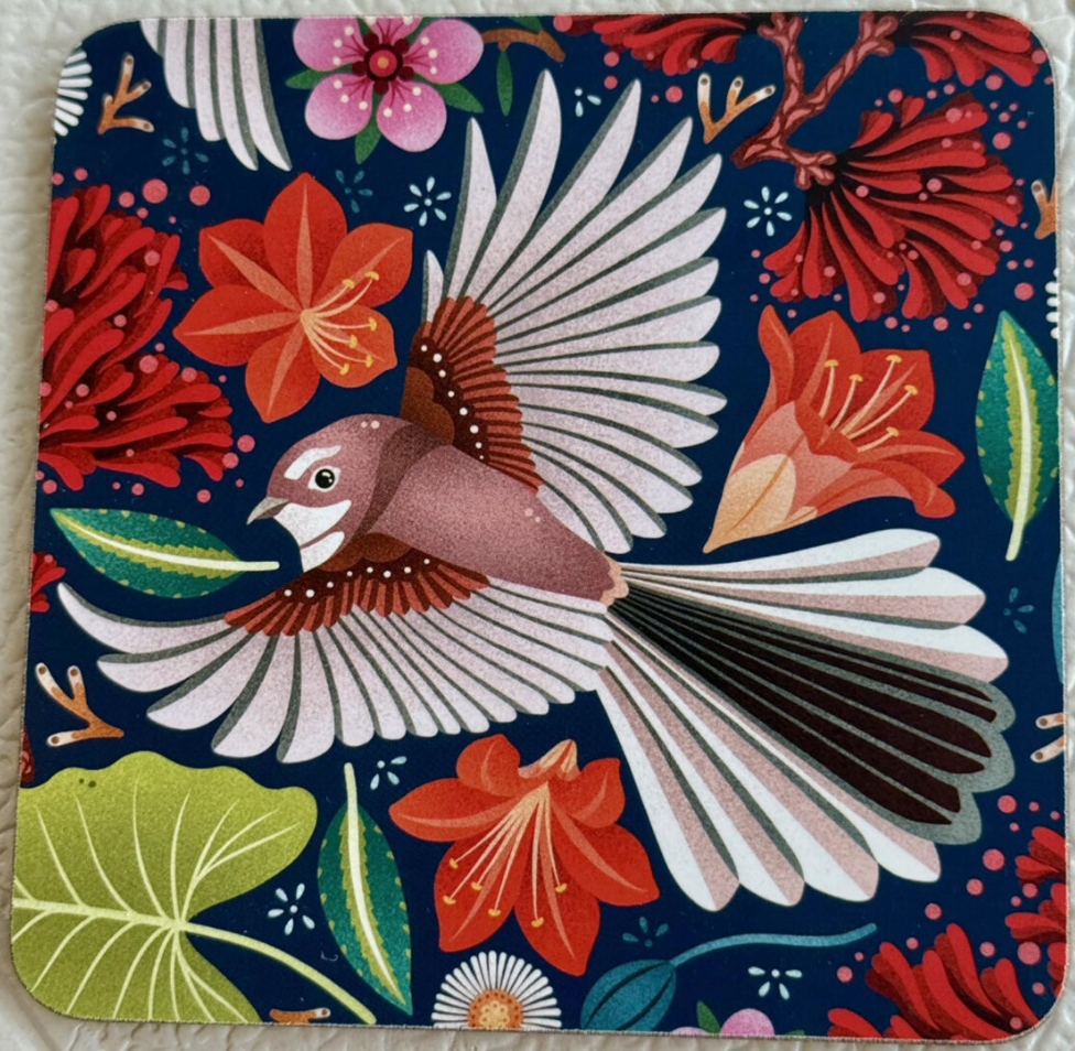 A square cork backed coaster featuring beautiful artwork of New Zealand Fantail Piwakawaka