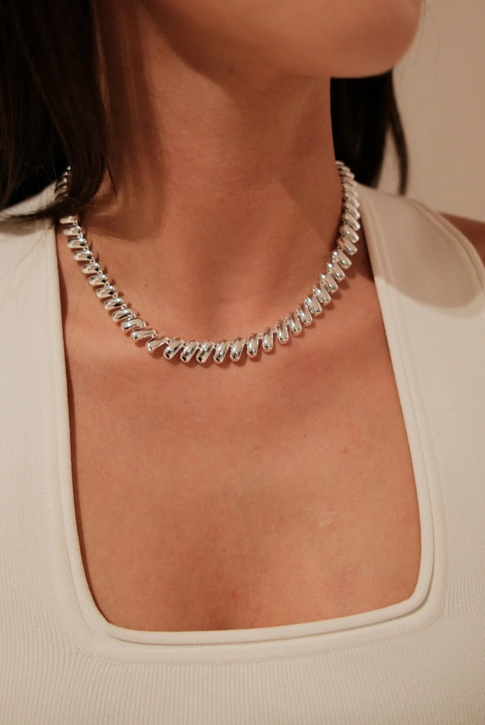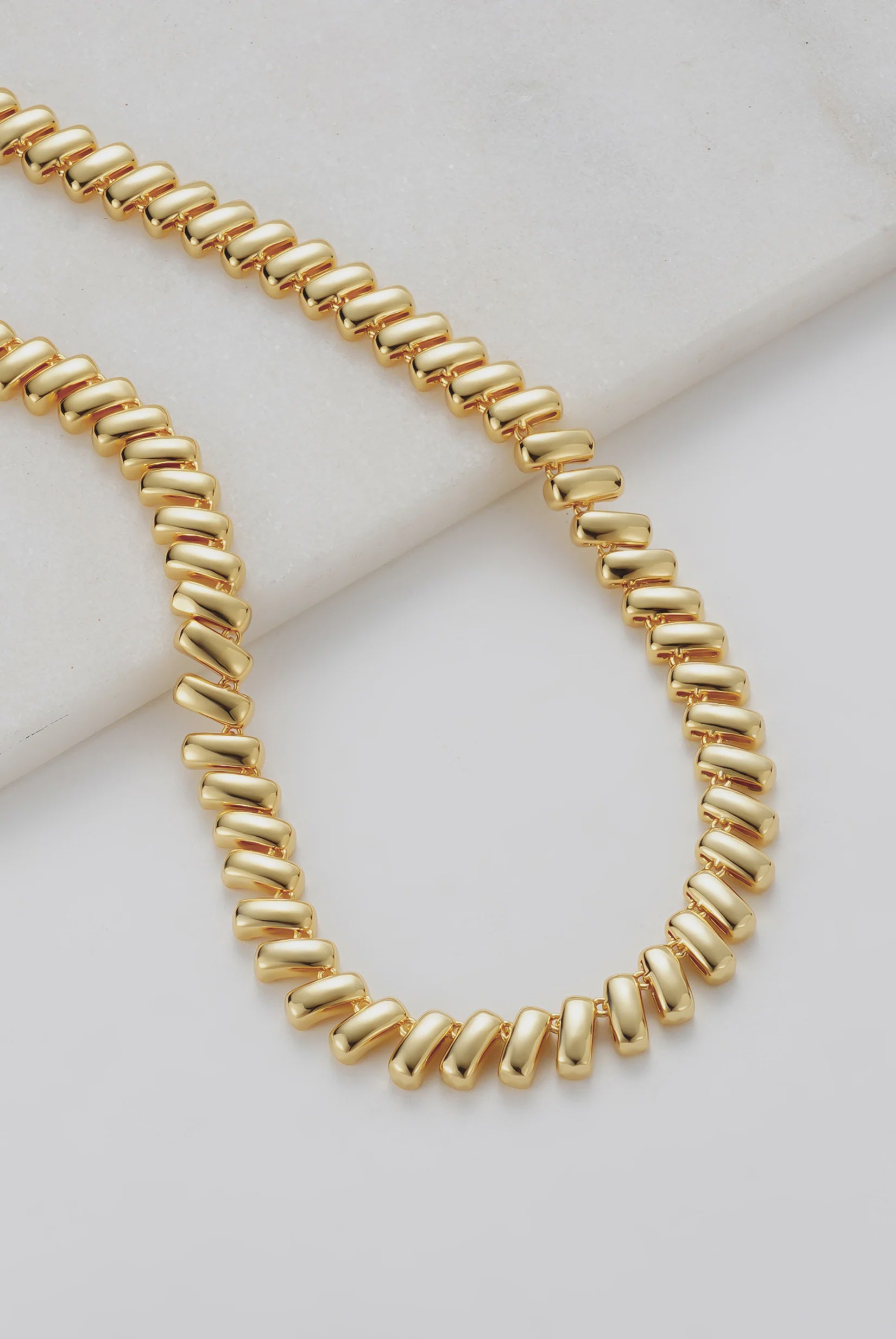 Emerson Necklace– Bold and striking, the Emerson Necklace is crafted from high-shine gold links with a modern, sculptural silhouette. Its chunky, fluid design makes it the perfect statement piece to elevate any outfit, whether worn alone or layered for a contemporary edge.