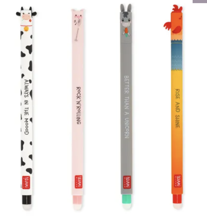 On the farm, everybody pitches in to get the job done! With the Set of 4 Erasable Gel Pens Farm Sweet Farm - Erasable Pen from Legami, you can bring a whole farmyard of animals to school with you inside your pencil case, where they'll be ready to help any time you make a mistake: just rub the sphere on the tip over the thermosensitive coloured ink to erase it and start over!
