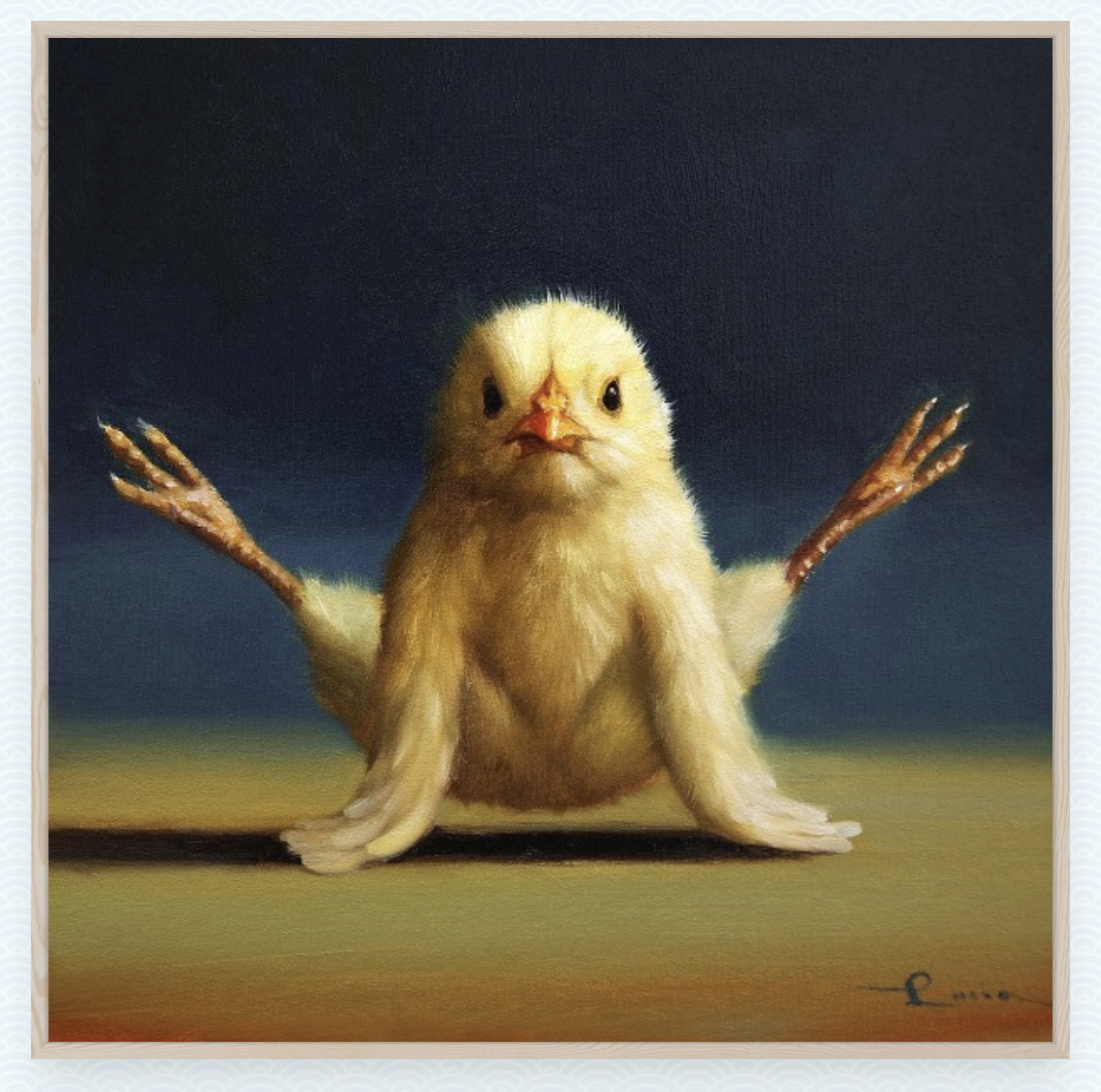 A lifelong animal lover, Lucia Heffernan paints whimsical portraits of animals in all-too-human scenarios. The artist received a BFA from Binghamton University in 1989, and her detailed oil paintings have attracted a following for their gently satirical humor. Heffernan’s dressed-up, anthropomorphized figures from across the animal kingdom often engage in leisure activities: In the punny Roller Chick (2020), a fluffy bird sports 1980s-style roller skates and a boom box.