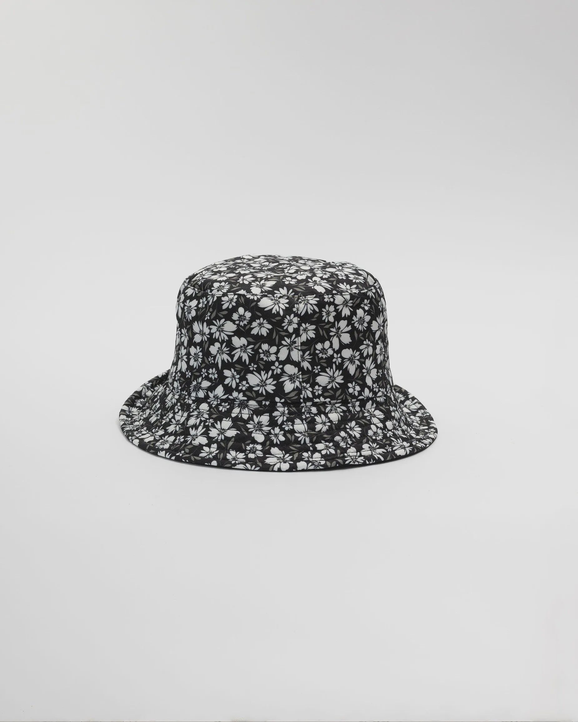 Reversible bucket hat with floral print on one side and black on the reverse side100% polyester