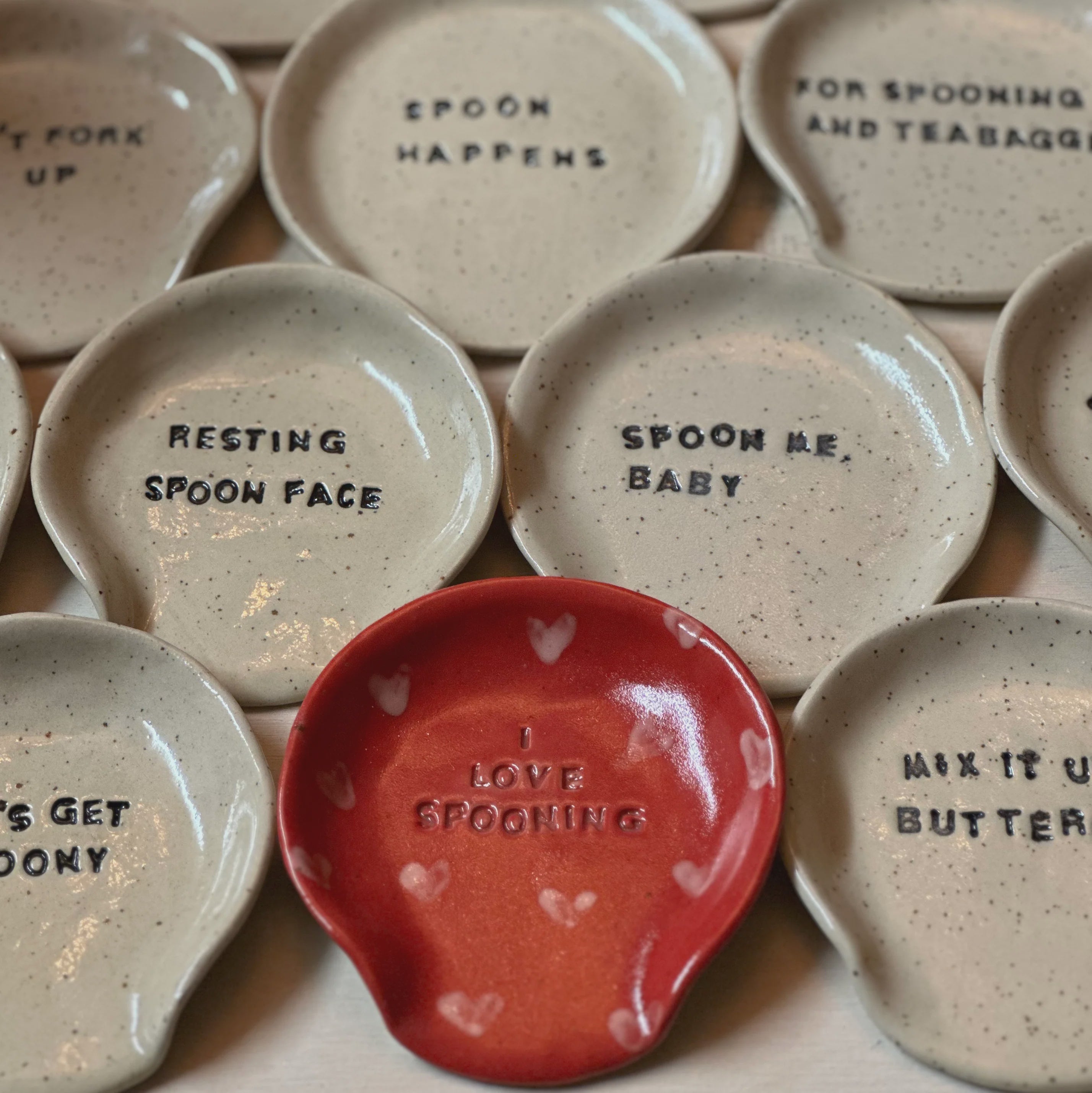 Whether it’s “Resting Spoon Face,” “Spoon Me,baby” or “You're a spoon” every piece is individually made, stamped, glazed, and fired in small batches. This means no two are ever exactly the same — just like the humans who love them.