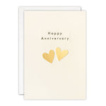A high quality anniversary card illustrated by Linda Tordoff and finished with gold foil. The front of the card features a simple image of two hearts, which are debossed and foiled in gold. The text on the front of the card sits in a debossed rectangle and reads 'Happy Anniversary'. The card is blank inside for your own message.