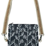 Fold-over bags with adjustable strap featuring stylised New Zealand designs by Jo Luping. The bag can be worn extended or folded over depending on how much you want to carry. This makes it a highly versatile bag for all your daily needs. The adjustable shoulder strap is a durable cotton canvas, 30mm wide x 1 metre long at full length, with cork stitched on top. The strap is removable and fastens to each side of the bag with quality heavy duty brass coloured hardware.