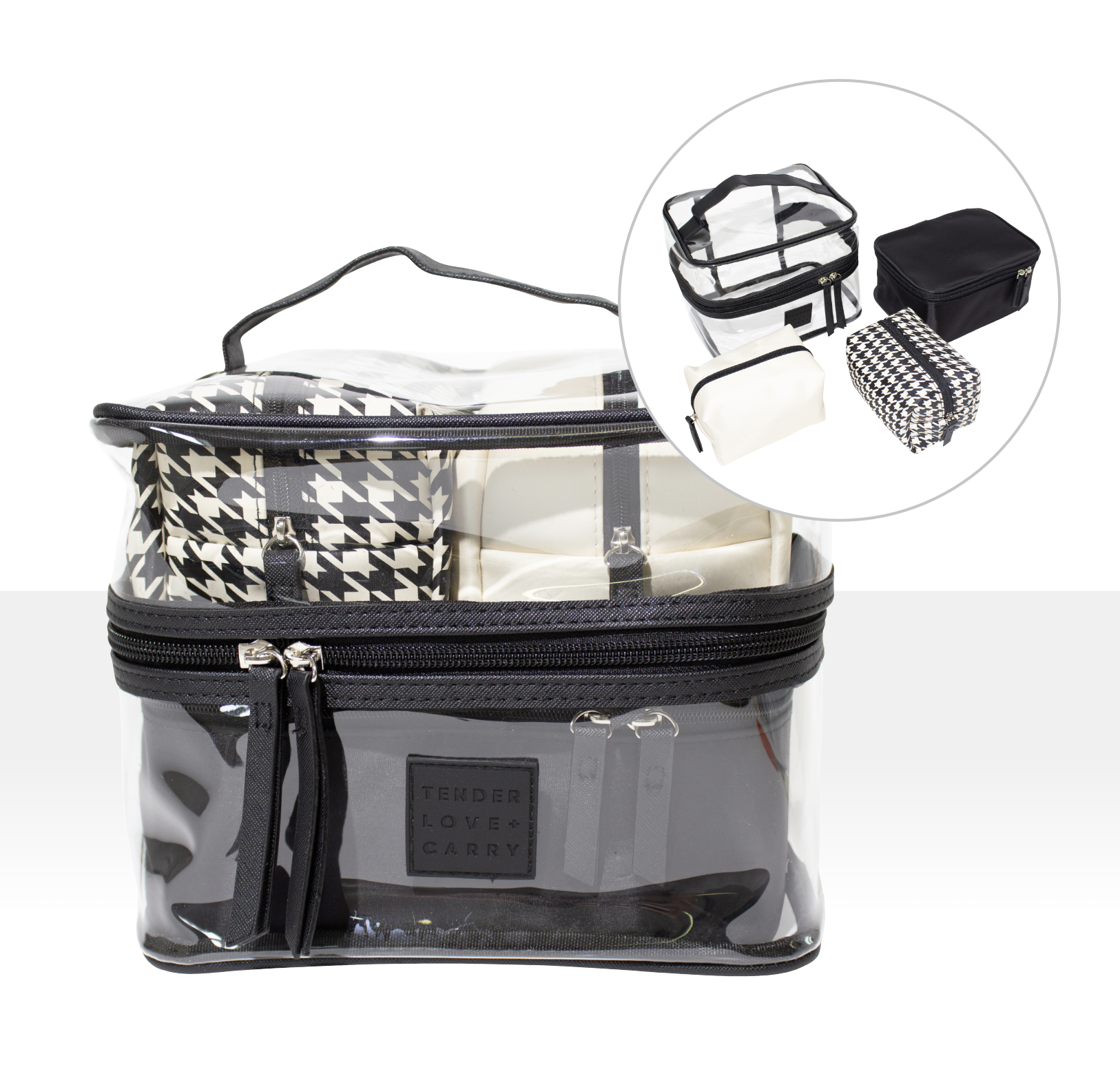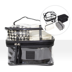 Set includes two mini pouches and one medium case all enclosed in a large clear case for handy storage of all your essentials.