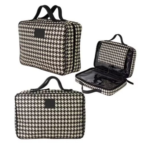 It features two large transparent pockets making cosmetics easy to find and stay organised. There is an extra sleeve inside useful for securing loose items.