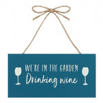 Made of MDF and strung on a jute rope this fun hanging sign is the perfect decor piece for any gardener. Features 'We're in the Garden Drinking Wine' text H:10 x W:20 x D:1 cm