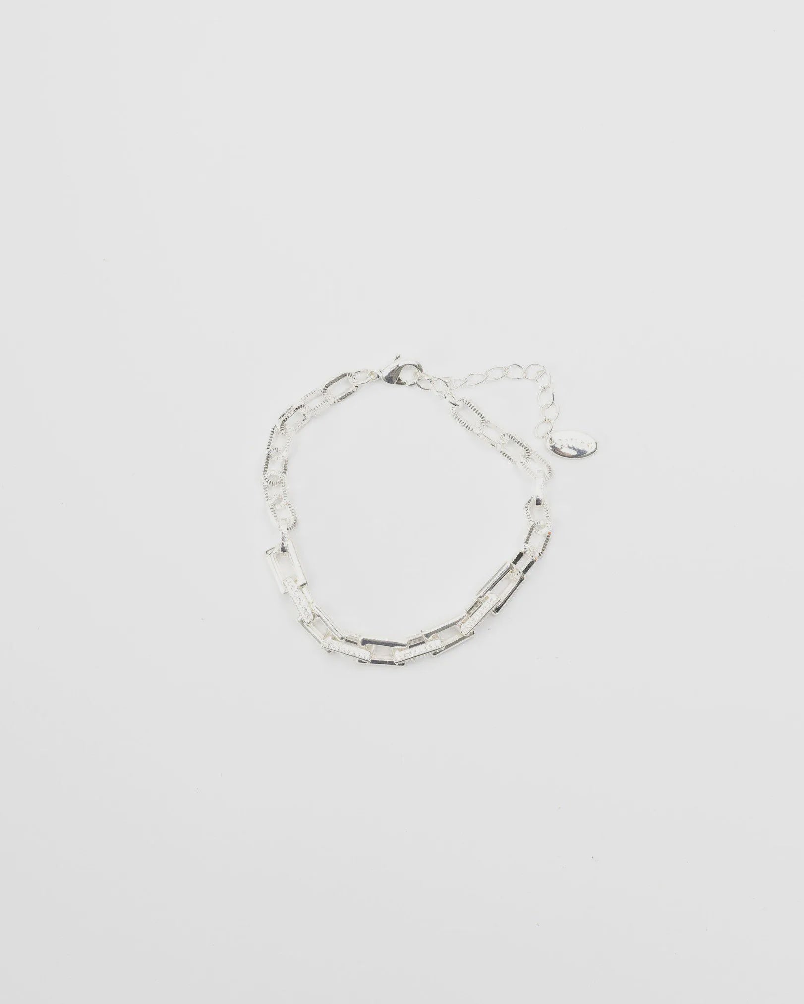 Silver plated bracelet with rectangle links and cubic zirconia embedded into every second link.