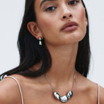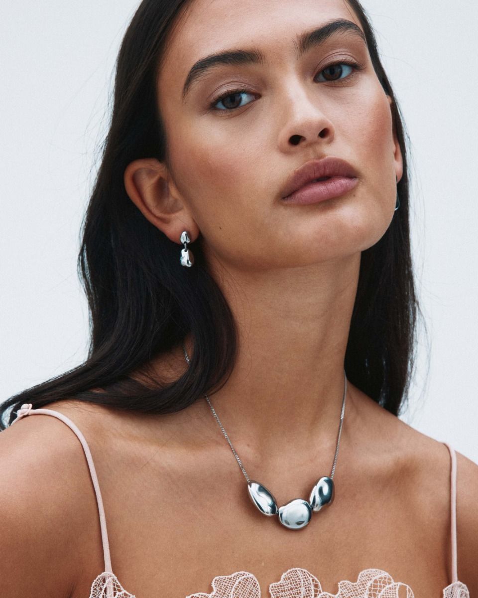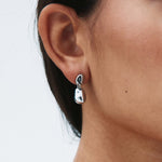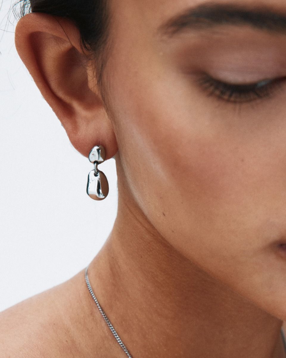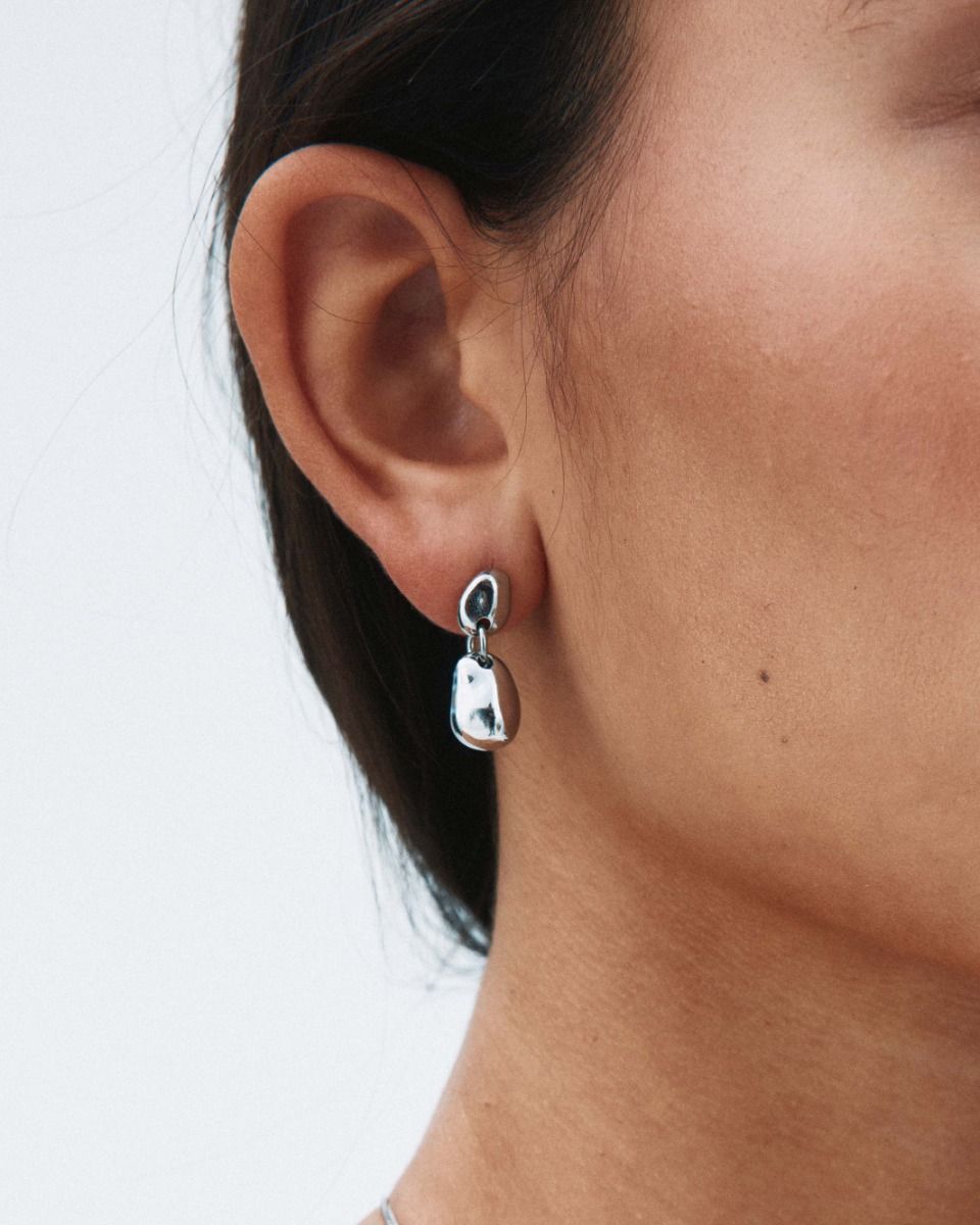 Leora is inspired by beach stones, gently shaped by the endless rhythm of the sea - a harmonious blend of natural contours and refined, minimalist elegance. Seen here in earrings in shiny stainless steel, with a larger irregularly-shaped stone dangling from a slightly smaller one.