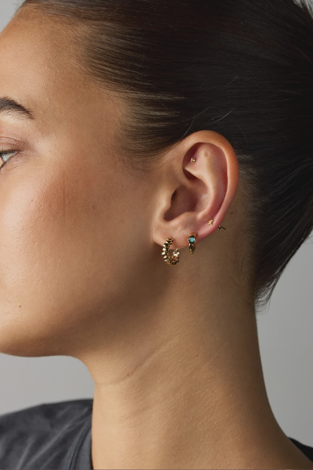 A delicate yet eye-catching piece, featuring a petite huggie hoop with a vibrant turquoise-coloured stone at its center. Perfect for adding a subtle pop of colour to your look, this elegant design is ideal for stacking or wearing solo for effortless everyday style.