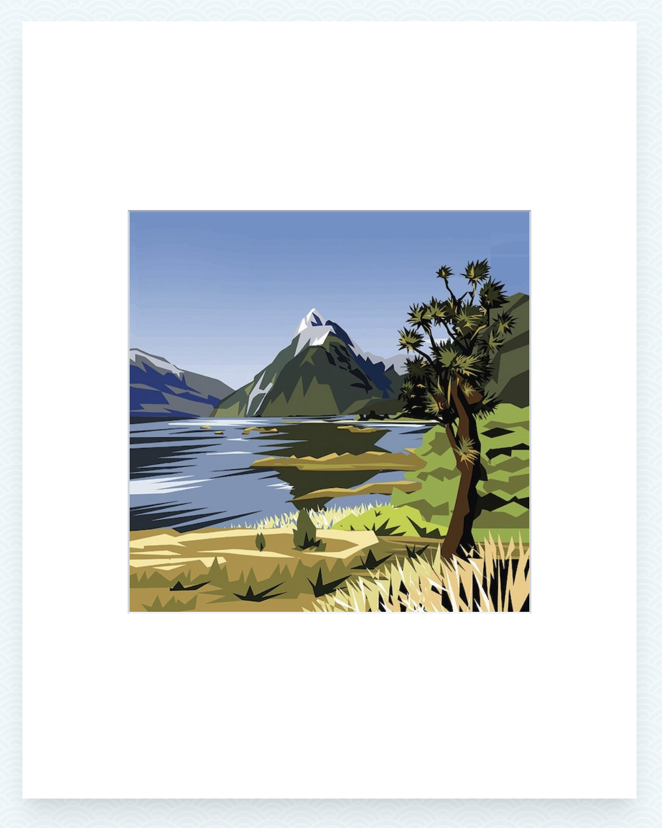35 x 27.5cm (18 x 18cm) Pre-Matted Mini Printrtist's Bio Queenstown-born artist Ira Mitchell is a trained teacher and BFA graduate. She is also an artist-educator for GOLDEN paints of New York, where she travels annually to train and show. A nomad by nature, she moves constantly to create images in locations that inspire her. Her work is informed by the bold palette of David Hockney, collages of Henri Matisse, and childhood delights of Eric Carl who created the Very Hungry Caterpillar.