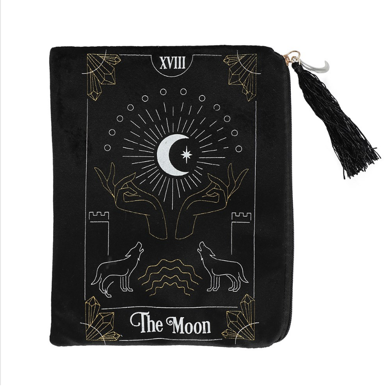 This velvet zipper pouch is the perfect place to keep tarot decks, crystals, beauty products and other treasures. Features a stunning white and gold moon tarot card illustration on the front and a matching tassel and crescent moon charm on the Part of The Fortune Teller range of mystical gifts and home decor.