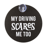 H:12 x W:12 x D:0.2 cm - Lighten the mood out on the road with this fun window sign which reads 'My driving scares me, too'. Perfect for letting your dark sense of humour shine through on the daily commute.