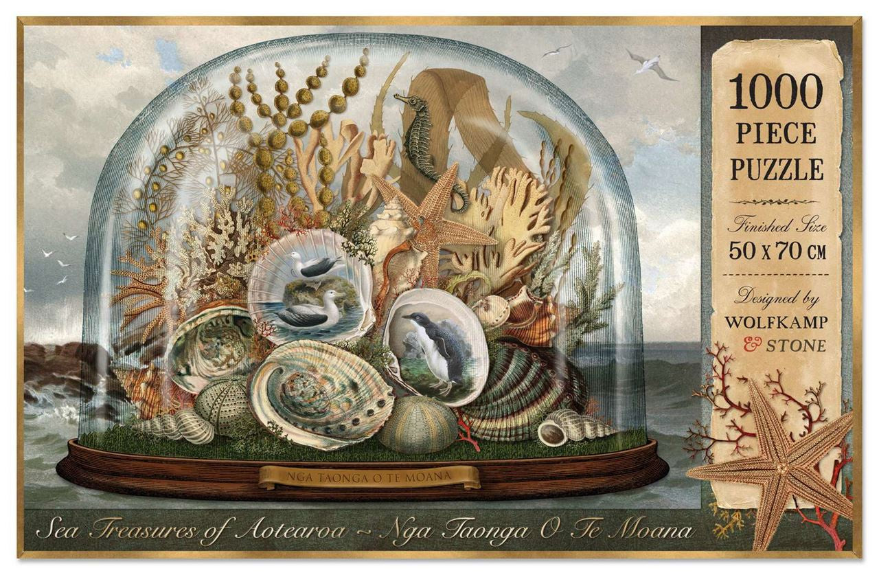 This intriguing puzzle is Tanya's homage to the Victorian natural history hobbyists who presented their "discoveries" as curiosities under large glass domes, she collected vintage prints of Aotearoa's favourite kai moana and set them among our native creatures in this intricate collage.