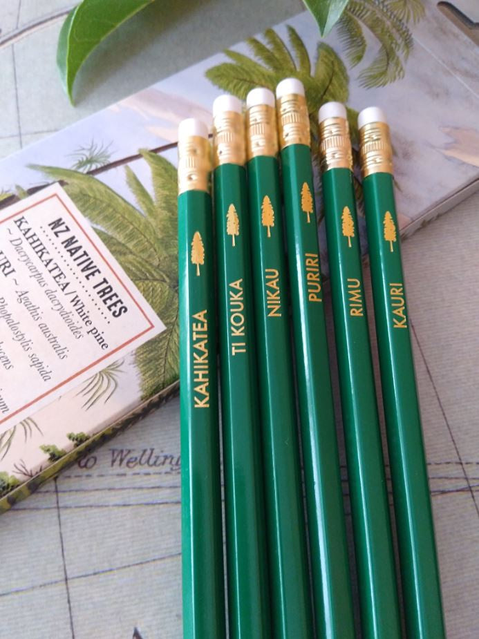 6 eraser tipped pencils in a beautifully illustrated box featuring New Zealand themes. Each pencil is uniquely printed.