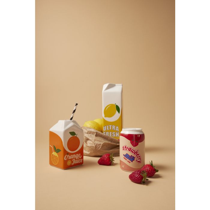This Lewis Ceramic Carton Vessel Small is crafted from ceramic in the shape of a juice carton with a fun orange juice print.