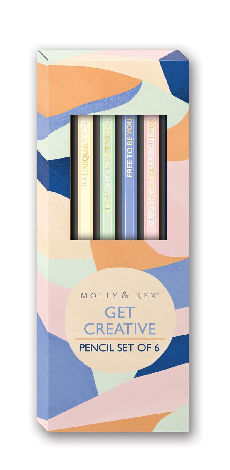 6 solid color wooden pencils with erasers and gold foiled text, in foil-embellished window box.