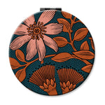 Matte black metal casing with matte black PU on both sides, and a hinged lid featuring a botanical print. Inside has a regular mirror on one side and a double magnifying mirror on the other.