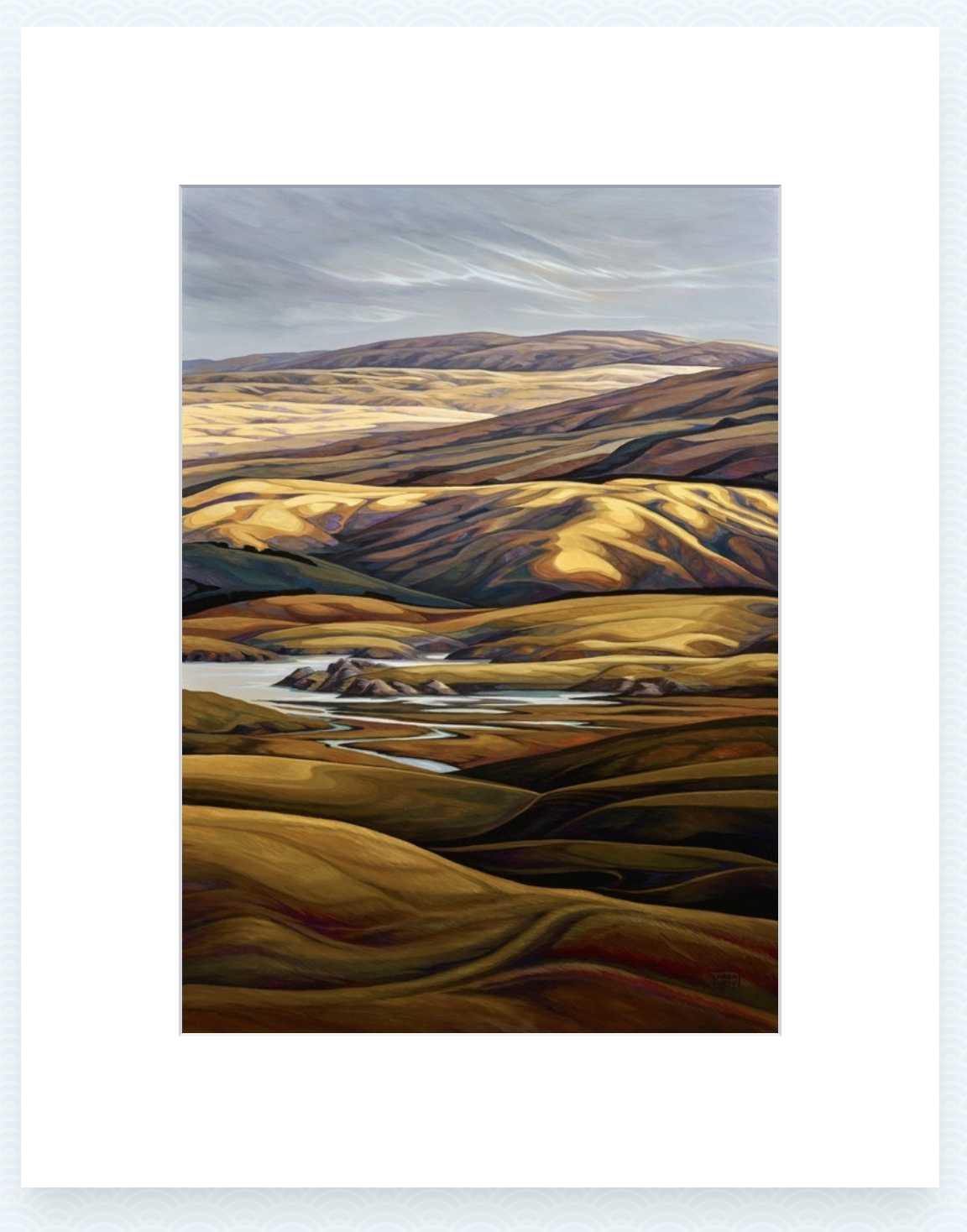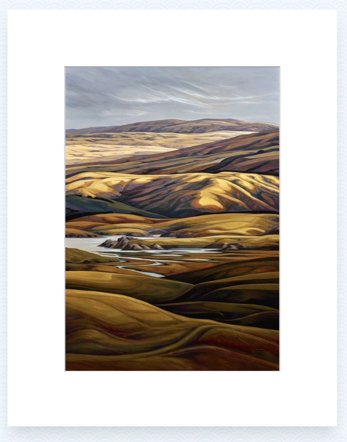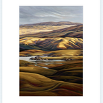 35 x 27.5cm (18 x 25.5cm) Pre-Matted Mini PrintMaria is an established Dunedin artist capturing the fluidity of the Otago landscape, for the past 30 years. Growing up, she was inspired by the dramatic dance of colour and light of Otago landforms. Maria's landscapes capture the stylized patterning of the folds of the hills, the light and shadows and colour emphasis, interweaving movements, like fabric or tapestry, and the interplay together with the clouds. She is drawn to the concept of the earth stretched out like fabric and we being formed and forged together as part of the Craftsman’s omnipotent design on the unseen loom