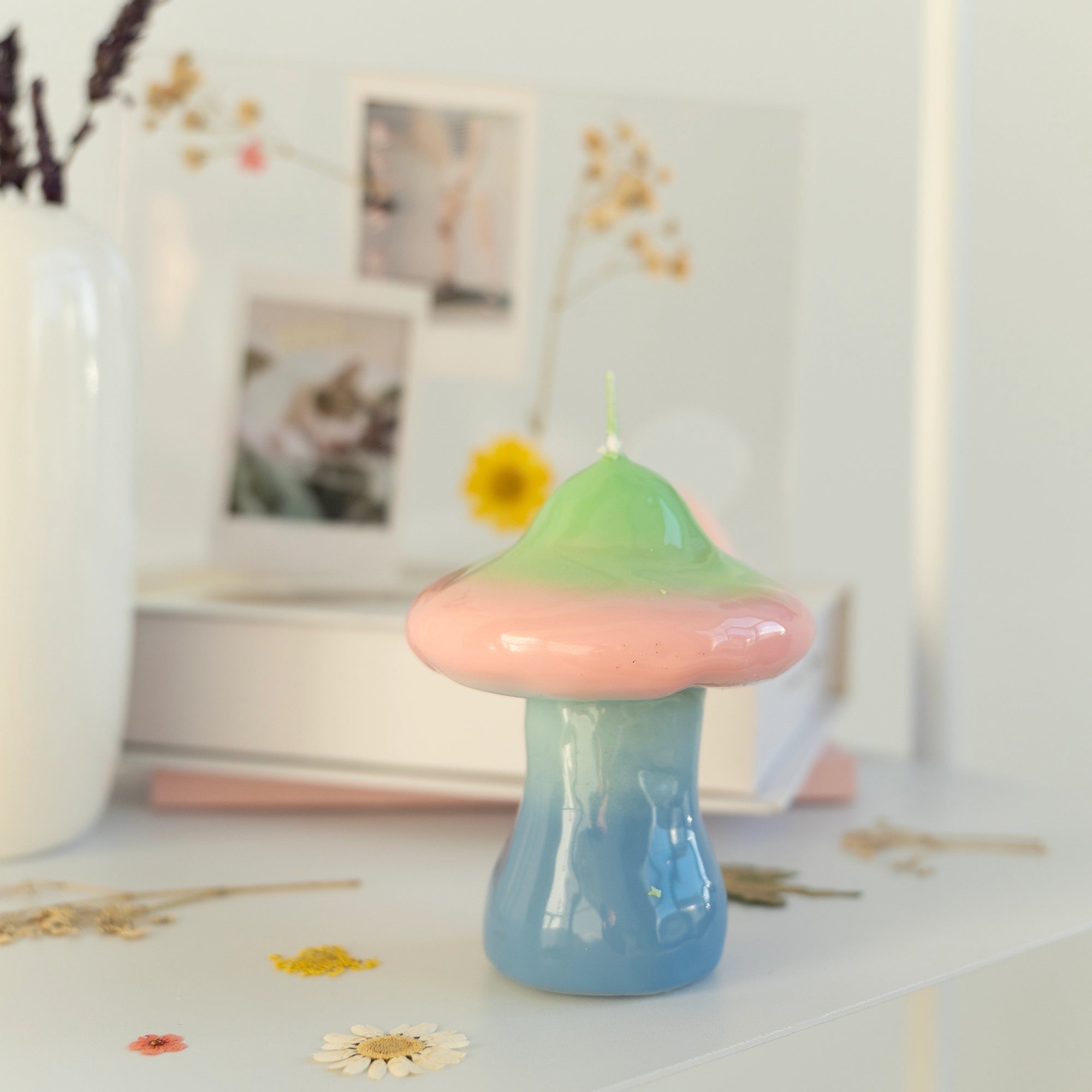 The small sunrise mushroom candle is a decorative candle that is designed to resemble a mushroom. Ideal for use as an eye-catcher in interior decoration. It can be placed on a flat surface, such as a table or shelf, to add a touch of colour and sophistication to a space. In addition to its decorative function, when lit, the candle provides a soft, ambient light, creating a cosy atmosphere. Measurements: 9,9x7,5x7,5cm